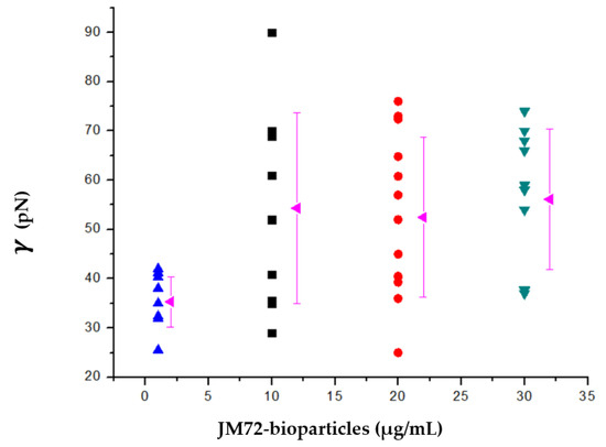 In determining the pore edge tension, the stage of pore closing is monitored by extracting the time dependence of the pore size, as previously described [37,47]. The results are shown in Figure 4. For POPC GUVs in solution without bioparticles we found an average edge tension of 35 pN, with a standard deviation of 5 pN. However, for POPC GUVs in a solution with small concentrations of bioparticle, the average edge tension increased to 54 pN at 1 and 2 μg/mL of JM72-bioparticles and to 56 pN at 3 μg/mL of JM72-bioparticles. The large standard deviation, over 10 pN, is inherent to the experimental conditions, since bioparticles are actually dispersed in the GUVs solution and not directly bonded to the lipid membrane, which represents a highly dynamic condition. Despite this, in performing ANOVA statistics (Bonferroni test), a significant increase of average edge tension (p < 0.05) in the presence of small concentrations of bioparticles is evidenced, compared to the result in absence of bioparticles.