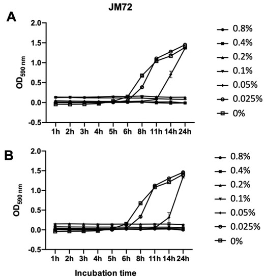 In both independent experiments, the control (0%) and the lower concentration of polypeptide (0.025%) showed the same results with a log phase at 6 and 8 h, respectively. At 0.05%, a slight difference was noticeable with a log phase at 11 h for the pure JM72, but an increase to 14 h for JM72-bioparticles. This result may suggest a slight improvement of the antibacterial action of the relatively low concentration of polypeptide when the same is transported by the bioparticle, corroborating that the effective interaction of the bioparticles with cell membranes may improve the effective action of carried bioactives, as previously described for similar praziquantel and invermectin drug release nanoparticles [25,26,27,28].