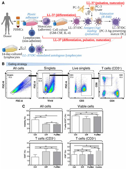 The impact of LL-37 on the DC functionality when implemented during DC differentiation or pulsation and maturation. (A) The LL-37 treatment strategy during ex vivo production of monocyte-derived DCs. The DCs were first differentiated from PBMCs to immature DCs in the presence of LL-37 (LL-37/iDC); then, following pulsation with antigen (Ag), they were matured using TLR7/8 agonist R-848 (LL-37/DC). The functionality of LL-37/DCs was tested in the 14-day-cultured lymphocytes generated by the stimulation of autologous lymphocytes with LL-37/DCs and subsequent cell culturing in the presence of a low concentration IL-2 (20 IU/mL). (B) The gating strategy of flow cytometry data obtained from analyses of DC-stimulated and 14-day-cultured autologous lymphocytes. (C) The viability (top left panel), frequency of T cells (CD3+; top right panel), and their CD8+ population (bottom panels) in the 14-day-cultured autologous lymphocytes stimulated with DCs treated with LL-37 during their differentiation (Diff), or PC-3 pulsation and R-848-induced maturation (Pul/Mat), or differentiation, PC-3 pulsation, and R-848-induced maturation (Combo). In (C), mean + SEM and significances of differences among the groups are indicated (NS p > 0.05, * p < 0.05; (C, top panels and bottom left panel) Ctrl: n = seven donors, Diff and Pul/Mat: n = six donors; one-way ANOVA with Tukey’s post-test; (C, bottom right panel) n = six donors; repeated measures (paired) one-way ANOVA with Tukey’s post-test).