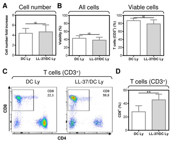 The application of LL-37 during DC production (differentiation, pulsation, and maturation) significantly enhanced CD8+ T cell enrichment of DC-stimulated autologous lymphocytes. (A) The cell number fold increase in the 14-day autologous lymphocytes stimulated with DCs (DC Ly), or DCs produced in the presence (differentiation, pulsation, and maturation) of LL-37 (LL-37/DC Ly). (B–D) The DC-stimulated and 14-day-cultured autologous lymphocytes were analyzed by flow cytometry. The gating strategy was as in Figure 1B, and cell viability (B, left panel), the frequency of T cells (CD3+) (B, right panel), and their CD8+ population (C,D) were determined. In (A,B,D), mean + SEM and significances of differences between the group of DC Ly and LL-37/DC Ly samples are indicated (NS p > 0.05, ** p < 0.01; n = eight donors; paired two-tailed Student’s t-test).