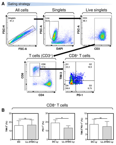 NK cells and T cells are often associated with the increased expression of inhibitory molecules PD-1 and TIM-3, whose blockade with anti-PD-1 and/or anti-TIM-3 blocking antibodies improves the functionality of these cells [23,24,25]. Our analyses revealed that LL-37 significantly decreased the frequency of PD-1-expressing CD8+ T cells in the DC-stimulated lymphocytes. These CD8+ T cells had a lower surface expression of the checkpoint inhibitor molecule PD-1 (Figure 3). On the other hand, no impact of LL-37 was observed on the surface expression of the immune checkpoint molecule TIM-3 (Figure 3). This finding showed that LL-37 also promoted DC-mediated cell culture enrichment with PD-1-downregulated CD8+ T cells, which could also contribute to the increased resistance of these cells to PD-1-mediated immunosuppression.
