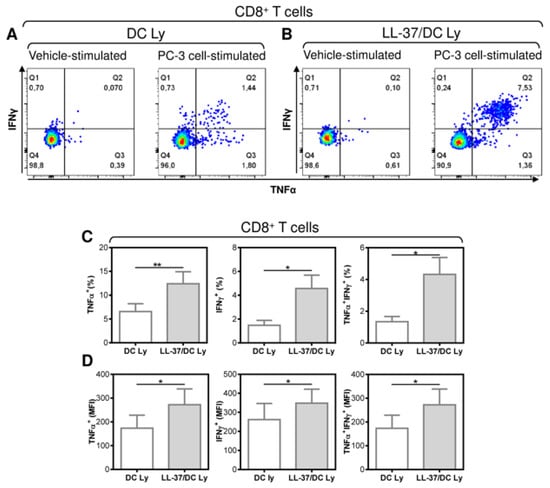The application of LL-37 during DC production (differentiation, pulsation, and maturation) significantly enhanced the enrichment of DC-stimulated autologous lymphocytes with tumor-cell-specific CD8+ T cells. The 14-day autologous lymphocytes stimulated with DCs (DC Ly) or DCs produced in the presence (differentiation, pulsation, and maturation) of LL-37 (LL-37/DC Ly) were re-stimulated with live PC-3 cells at the ratio of 5:1 (lymphocytes/PC-3 cells), and the frequency of TNF-α-, IFN-γ-, and TNF-α/IFN-γ-producing CD8+ T cells was determined by intracellular cytokine staining using flow cytometry. (A,B) The gating strategy of CD8+ T cells was as in Figure 1B and was followed by the gating of the cytokine-producing CD8+ T cells in vehicle- (vehicle-stimulated) or PC-3 cell (PC-3 cell-stimulated)-stimulated DC Ly (A) and LL-37/DC Ly (B) samples. (C) The frequency of TNF-α- (left panel), IFN-γ- (middle panel), and TNF-α/IFN-γ (right panel)-producing CD8+ T cells was determined by intracellular cytokine staining in DC Ly- and LL-37/DC Ly samples. (D) The mean fluorescence intensity (MFI) of TNF-α- (left panel), IFN-γ- (middle panel), and TNF-α/IFN-γ (right panel)-producing CD8+ T cells was determined by intracellular cytokine staining in DC Ly and LL-37/DC Ly samples. In (C,D), mean + SEM and significances of differences between the group of DC Ly and LL-37/DC Ly samples are indicated (* p < 0.05, ** p < 0.01; (C) n = eight donors, (D) n = six donors; paired two-tailed Student’s t-test).