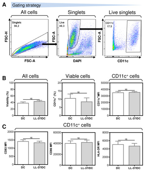 The application of LL-37 during DC production (differentiation, pulsation, and maturation) had no impact on DC viability, yield, or maturation. (A) The gating strategy used to analyze flow cytometry data. (B) The viability (left panel), DC frequency (CD11c+, middle panel), and their CD11c+ staining intensities (right panel). (C) The staining intensities of the DC maturation markers CD83 (left panel), CD86 (middle panel), and HLA-DR (right panel). In (B,C), mean + SEM and significances of differences between the group of DC and LL-37/DC samples are indicated (NS p > 0.05; n = five donors; paired two-tailed Student’s t-test).