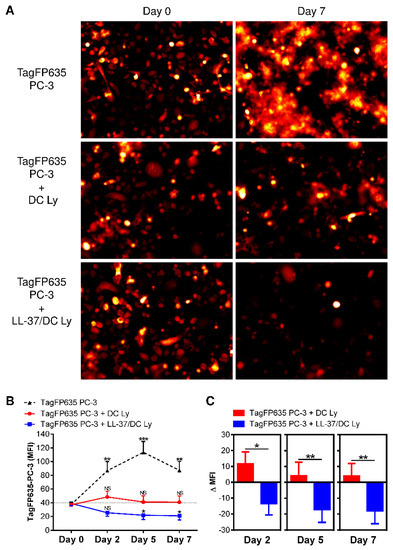The application of LL-37 during DC production (differentiation, pulsation, and maturation) significantly enhanced the cytotoxic impact of DC-stimulated autologous lymphocytes on cultured tumor cells. (A) The 14-day autologous lymphocytes stimulated with DCs (DC Ly) or DCs produced in the presence (differentiation, pulsation, and maturation) of LL-37 (LL-37/DC Ly) were co-cultured with fluorescent TagFP635 PC-3 cells at the ratio of 5:1 (lymphocytes: PC-3 cells) for 7 days. TagFP635 fluorescence in the co-culture was acquired on days 0 (left images) and 7 (right images) of co-culturing. (B) The TagFP635 fluorescence in the co-culture was acquired on days 0, 2, 5, and 7 of co-culturing, and the mean fluorescence intensity (MFI) of the acquired images was calculated. The differences in the MFIs of individual days of co-culture for individual samples were statistically evaluated. The data represent mean + SEM or mean—SEM, and the significance of differences among the MFIs are indicated (NS p > 0.05, * p < 0.05, ** p < 0.01, *** p < 0.001; n = eight donors; repeated measures one-way ANOVA with the Tukey’s post-test). (C) The differences between the MFIs before co-culturing (day 0) and at each individual day of co-culturing (days 2, 5, and 7) (ΔMFIs) were calculated for the DC Ly and LL-37/DC Ly samples and statistically evaluated. The data represent means + SEM or means—SEM, and the significance of differences among the ΔMFIs are indicated (* p < 0.05, ** p < 0.01; n = eight donors; paired two-tailed Student’s t-test).