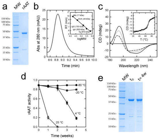 (a) Coomassie blue-stained SDS-PAGE gels of purified rAAT. (b) SEC chromatogram and calibration curve (inset). (c) Circular dichroism spectra of rAAT before heating (solid line), upon incubation at 90 °C (dashed line), and after a slow return to 20 °C (dotted line). Inset: Thermal ramp experiment between 20 and 90 °C; the black line is the fitting obtained with the CalFitter algorithm. (d) Antielastase activity of rAAT sampled over time upon storage at −80 °C, −20 °C, 4 °C, and 25 °C. Data are shown as mean ± SE. (e) SDS-PAGE of rAAT solution before (t0) and after incubation at 4 °C for 4 weeks (t = 4 w).