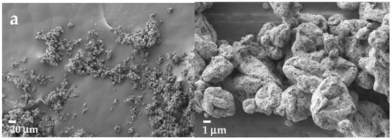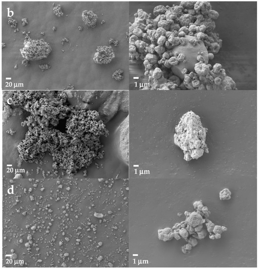 The morphology of spray-dried formulations was investigated by a scanning electron microscope (FESEM-FIB Zeiss Auriga Compact, Darmstadt, Germany). Samples were prepared by depositing powder on adhesive carbon tapes mounted on aluminum stubs and by removing excess powder with a gentle nitrogen flow. High vacuum conditions (1.87 × 10−4 Pa) were reached by depressurization and images were taken with an accelerating voltage of 1.0 kV and a working distance of 4.9 mm.