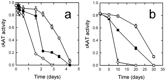 Stability of SD-rAAT powder stored in air (a) and oxygen-free atmosphere (b) at −20 °C (open squares), 4 °C (closed squares), and 25 °C (open circles). Data are shown as mean ± SE.