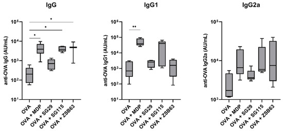 Lipophilic MDP derivatives have shown a tendency to promote a Th1-biased cellular immune response, especially when used in conjunction with liposomes. To determine if and how the introduction of specific lipophilic moieties into the structure of compound SG29 affects the in vivo adjuvant activity, an immunization study was conducted in a murine model of adjuvanticity. Specifically, SG29 and its lipidated analogs SG115 and ZSB63 were investigated for the induction of systemic immune responses against the model antigen OVA. Five groups of NIH/OlaHsd mice were immunized with OVA-containing neutral liposomes, either alone or additionally adjuvanted with our positive control MDP or the desmuramylpeptides SG29, SG115, and ZSB63. After the second booster dose, the mice sera were collected and examined for OVA-specific IgG antibodies (Figure 1).