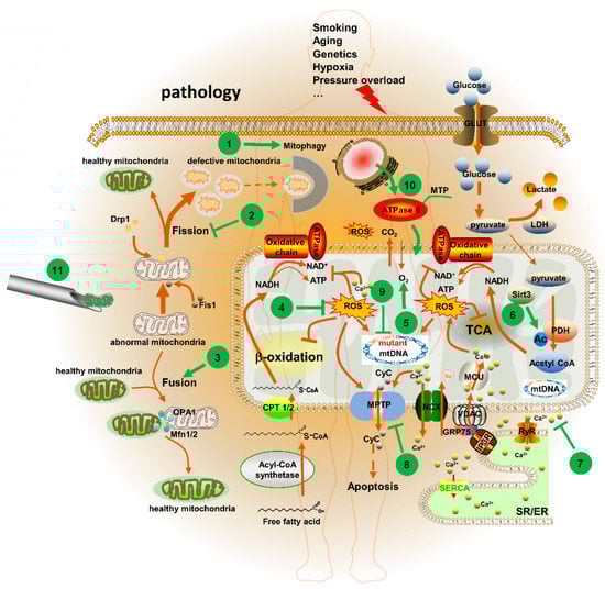 - Forte, M.; Schirone, L.; Ameri, P.; Basso, C.; Catalucci, D.; Modica, J.; Chimenti, C.; Crotti, L.; Frati, G.; Rubattu, S.; et al. The role of mitochondrial dynamics in cardiovascular diseases. Br. J. Pharmacol. 2021, 178, 2060–2076. [Google Scholar] [CrossRef] [PubMed]