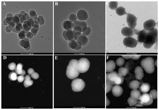 STEM images for nanoformulations before and after polymeric-FA coating showing the morphological changes. (A) TEM image: MSN. (B). TEM image: MSNPCLCR. (C) TEM image: MSNPCLCR/CSCEFA. (D) STEM image: MSN. (E) MSNPCLCR. (F) MSNPCLCR/CSCEFA.