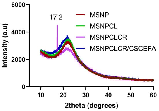 The XRD patterns for MSNP and nanoformulations are shown in Figure 2. Few changes were observed related to shifting in the patterns for MSNP, MSNPCL, MSNPCLCR, and MSNPCLCR/CSCEFA, centered at ~22° and characterizing the amorphous phase of the silica framework. Only one crystalline peak at 17.2° was observed for MSNPCLCR, corresponding to the attachment of a small fraction of CR molecules [10] presenting on the surface, as compared with the MSNPCL (CL alone). Of note, this peak disappeared after polymer coating, as seen in MSNPCLCR/CSCEFA. This observation particularly confirmed the successful shell coating/embedding, in agreement with observations from the TEM and STEM images (Figure 1).