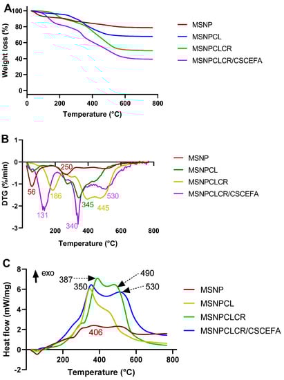 After all of the materials were heated to ~770 °C, we observed a great change in mass loss (wt.%). The weight loss varied from 21.5 wt.% (MSNP) to 32.4 wt.% (MSNPCL), 50.5 wt.% (MSNPCLCR), and 60.9 wt.% (MSNPCLCR/CSCEFA), respectively, ascribed to the surface modification with phosphonate groups, CL loading, co-loading of CR and CL, and coating with polymer mixtures (Figure 3A, Table 1). The weight loss of MSN (data are not shown) about 15.5 wt.%, so phosphonate content in MSNP was about 6 wt.%. The calculated total prodrug content (TPC, wt.%) was 10.9 wt.% for MSNPCL, 18.1 wt.% for MSNPCLCR, and 18.1 wt.% for MSNPCLCR/CSCEFA. The polymeric shell content was 10.3 wt.%. There was a broad peak at 280 °C for MSNP, resulting from phosphonate group decomposition (Figure 3B). The DSC curves presented a broad peak centered at 406 °C for MSNP (Figure 3C). In nanoformulations, DTG spectra displayed several broad peaks centered at 345 °C (MSNPCL), 186 °C and 445 °C (MSNPCLCR), and 131 °C, 340 °C, and 530 °C (MSNPCLCR/CSCEFA) (Figure 3B). All of these peaks were attributed to the decomposition of organic content—both CL and CR and polymeric substances in the case of coating, which takes place through stages corresponding to heading temperature. The first stage occurred from room temperature to 200 °C, and the second stage occurred from 300 °C to 600 °C. In agreement with the DTG results, the main changes in DSC curves (Figure 3C) were detected in the 300 °C to 600 °C range for nanoformulations. MSNPCL resulted in an exothermic peak centered at 350 °C, MSNPCLCR had exothermic peaks at 387 °C and 490 °C, and MSNPCLCR/CSCEFA had exothermic peaks at about 350 °C and 530 °C. These peaks in nanoformulations likely are the result of their shifting from the location of the original peaks associated with the free natural agents. The shifted peaks could indicate the attachment of some number of free agents to the surface in a crystalline form, in agreement with the XRD results obtained for MSNPCLCR, which presented a sharp crystalline peak at 17.2°.