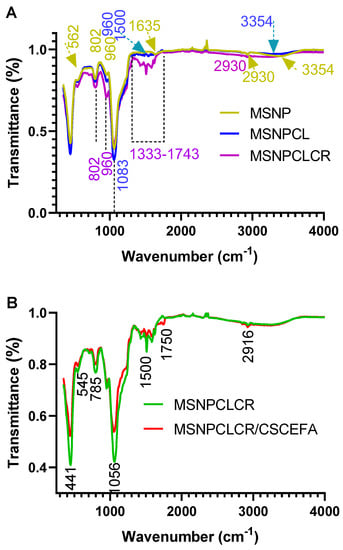 FTIR-ATR spectra showed obvious changes in surface-modified nanoparticles and nanoformulations (Figure 4A). In MSNP, several peaks were shifted, intensified, or new, as seen at 562, 802, 960, 1635, 2930, and 3354 cm−1, which strongly confirmed the surface modification compared with MSNs [39]. Concerning nanoformulations, the spectra obtained for MSNPCL showed a clearly shifted peak at 960 cm−1, a new peak at 1600 cm−1, and a peak at 3354 cm−1 that was slightly less intense compared with MSNP. Further CR loading, as indicated by MSNPCLCR, resulted in more intensive peaks at 802 and 960 cm−1, new peaks in the region between 1333 to 1743 cm−1, and broader peaks centered at 2930 cm−1. These peaks could have corresponded to the presence of loaded CR. For the changes before and after polymeric coating, Figure 4B shows the changes between MSNPCLCR and MSNPCLCR/CSCEFA in several positions. The intensive peaks at 441, 545, 785, 1056, 1500, 1750, and 2916 cm−1 in MSNPCLCR were slightly lower in MSNPCLCR/CSCEFA because of the polymeric coating.