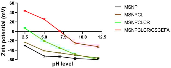 Figure 5 depicts the changes in zeta potential values for MSNP and nanoformulations suspended in deionized water related to changes in pH. Both MSNP and MSNPCL were negatively charged in acidic, neutral, and alkaline media, and increasing pH to 12.5 resulted in high negative zeta potential of −59.9 ± 2.5 mV and −56.5 ± 0.9 mV, respectively. MSNPCLCR showed only a positive zeta potential of 6.6 ± 1.0 mV at pH 2.5, but the zeta potential turned negative and reached ~−60 ± 2.8 mV at pH 12.5. MSNPCLCR/CSCEFA showed a different pattern with a positive zeta potential of 43.3 ± 0.7, 25.6 ± 1.2, and 0.7 ± 0.6 at pH 2.5, 5, and 7 (from acidic to neutral), respectively. As the medium became alkaline, there was a shift, to −24.9 ± 1.8 and −32.4 ± 1.4 at pH 9 and 12, respectively.