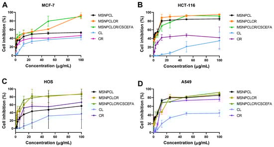 As Figure 6 shows, the anticancer effect increased with increasing treatment concentration in all four cancer cell lines. Nanoformulations compared with free CL and CR tended to be the most significantly effective treatments (p < 0.05), inhibiting all four cell line cells. MSNPCLCR and MSNPCLCR/CCFA generally had better anticancer effects than MSNPCL, which was expected. Free CR had a greater anticancer effect than free CL on all cells. Figure 6A shows that MSNPCLCR/CCFA, MSNPCLCR, and MSNPCL produced the highest anticancer effect at >90% (no significant differences among these nanoformulations), followed by CR (~47%) and CL (~42%). As shown in Figure 6B, the most effective treatments against HCT-116 were nanoformulations compared with free CL or CR. Despite a lack of significant differences among the nanoformulations, their anticancer potential was ordered as follows: MSNPCLCR > MSNPCLCR/CCFA > MSNPCL. Similarly, as shown in Figure 6C, MSNPCLCR and MSNPCLCR/CCFA exhibited the highest anticancer activity against HOS cells compared with MSNPCL, CR, and CL. We found no significant difference between CR and MSNPCR. As Figure 6D shows, there were no significant differences among the treatments, but in A549 cells, free CL showed the lowest anticancer effect compared with other treatments.