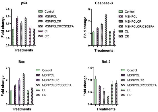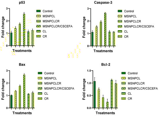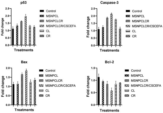 To identify a potential mode of action for the growth inhibitory effects of nanoformulations and free natural agents against cancer cell lines (HCT-116, MCF-7, HOS), we examined expression of key apoptosis genes. We observed potential enhanced effects of nanoformulations compared with free CL and CR on the three cancerous cell lines after a 72 h exposure to IC50 concentrations (MCF-7, Figure 7; HCT-116, Figure 8; HOS, Figure 9). The most effective treatments were detected in this order: MSNPCLCR/CSCEFA > MSNPCLCR > MSNPCL > CR > CL. The pro-apoptosis p53, Bax, and caspase-3 were significantly upregulated, and the anti-apoptosis Bcl-2 was downregulated in all cancer cells. Of note, a high apoptosis induction rate was observed in HCT-116 cells compared with MCF-7 and HOS. As indicated from the results, MSNPCLCR/CSCEFA was the most effective treatment for HCT-116, which showed elevated expression of p53 (~2.5 ± 0.12 fold change), caspase-3 (~2.6 ± 0.05 fold change), and Bax (~2.6 ± 0.11 fold change) and decreased expression of Bcl-2 (by ~0.24 ± 0.11 fold).