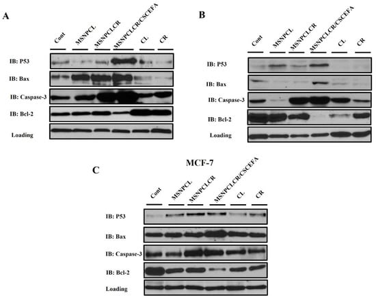 To further explore potential mechanisms, we used immunoblotting with specific antibodies against p53, caspase-3, Bax, and Bcl-2 to trace the path of the cell death program in MCF-7, HCT-116, and HOS cell lines after 72 h of incubation with treatments. The results indicated that p53, caspase-3, and Bax proteins increased in the three cell lines exposed to treatment with the IC50 of MSNPCR/CSCEFA compared with MSNPCL, MSNPCLCR, CL, and CR (Figure 10). Levels of the pro-apoptosis Bcl-2 protein were reduced or undetected with MSNPCR/CSCEFA treatment relative to untreated controls. These results indicated that, compared with controls, the MSNPCR/CSCEFA nanoformulation had more potential for apoptosis induction against HCT-116, followed by HOS and MCF-7 cells.