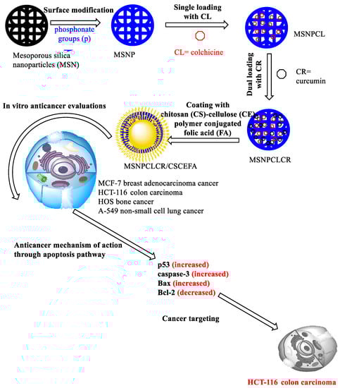 In this study, we fabricated a CDNS for colchicine (CL) and CR made of phosphonate-functionalized MSNs carrying both agents as a core and bearing a polymeric coating of chitosan (CS)-cellulose (CE) conjugated with a folic acid (FA)-targeting ligand (as coating shell), as shown in Scheme 1. To the best of our knowledge, the combination of curcumin with colchicine as anticancer model natural compounds loaded in mesospheres has not been studied yet. Our findings indicate enhanced anticancer effects with the combination, which proved to be efficiently selective for killing colon cancer cells. To our knowledge, the co-delivery of CR and CL in a system using drug-loaded MSNs for cancer treatment has not been reported previously. The current findings suggest that this construct could improve anticancer therapeutic efficiency of CL while decreasing its toxicity to normal cells, which to date has prevented its clinical use [31,32,33,34,35].