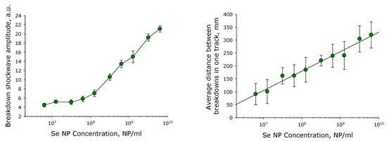 The effect of Selenium Nanoparticles Concentration on the Amplitude of Acoustic Oscillations and the Average Distance between Optical Breakdowns during Laser Fragmentation. Data are presented as means ± standard error of the mean. The three independent experiments were carried out for each variant (n = 3).