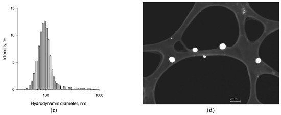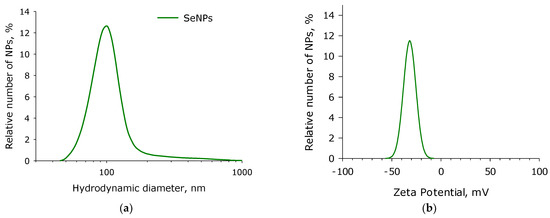 The resulting nanoparticles were studied using the dynamic light scattering method. Thus, by controlling the physicochemical processes in the experimental cell, we managed to obtain nanoparticles with a rather narrow size evolution (Figure 2a). It is shown that the average hydrodynamic diameter of nanoparticles is close to 100 nm. The distribution half-width is about 35 nm (from 70 to 105 nm). TEM data confirm these results (Figure 2c,d). The average diameters of dried SeNPs were 94–96 nm. The ζ-potential of SeNPs were about ~30 mV (Figure 2b).