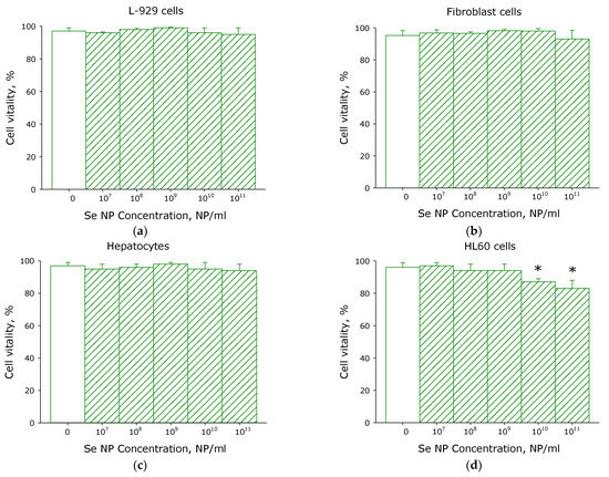 The effect of selenium nanoparticles in different concentrations on the survival of cells of various origins: L-929 cells (a), fibroblasts (b), hepatocytes (c), HL60 cells (d). Data are presented as means ± standard error of the mean. The three independent experiments were carried out for each variant (n = 3). *—difference from the control values (p < 0.05). The significance of differences was assessed by the Mann–Whitney test.