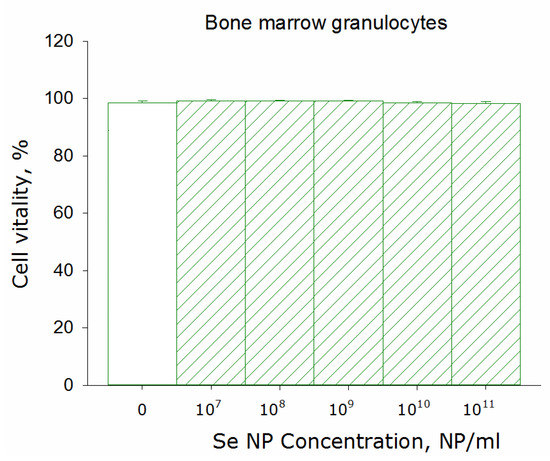 The effect of selenium nanoparticles in different concentrations on the survival of murine bone marrow granulocytes after 24 h incubation. Data are presented as means ± standard error of the mean. The three independent experiments were carried out for each variant (n = 3).