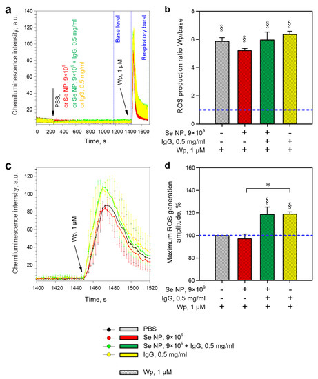 It is known that granulocytes are cells of nonspecific immunity as a kind of first line of defense of the body. The main functions of granulocytes are the neutralization of microorganisms by generating ROS in the focus of infection. In this regard, the effect of selenium nanoparticles on the rate of ROS production by mouse bone marrow granulocytes was studied. Recently, a lot of information has appeared in the literature regarding the interaction of granulocytes with antibodies; therefore, the total fraction of the IgG antibodies was used together with selenium nanoparticles. It has been shown that adding selenium nanoparticles or antibodies (IgG) to granulocytes does not increase the production of ROS (Figure 5 and Figure 6). SeNPs do not modify the respiratory burst of granulocytes induced by Wp (Figure 5b,d) or PMA (Figure 6b,d).