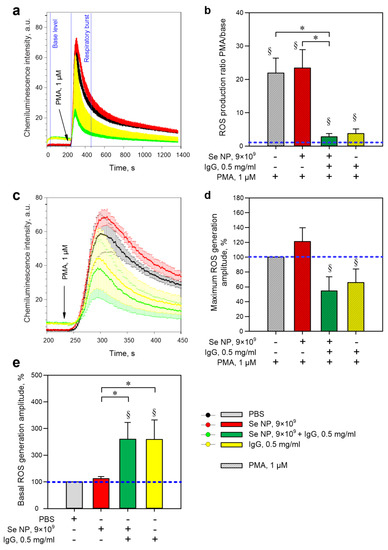 Furthermore, the addition of IgG also does not affect the total production of ROS (Figure 5b) but increases the maximum amplitude of the response (Figure 5d). The combination of IgG and SeNPs also increased the maximum amplitude of ROS generation in response to Wp, though it did not change the total ROS production in 250 s (Figure 5b,d). The presence of selenium nanoparticles did not modify the effects of IgG. Selenium nanoparticles did not affect the maximum amplitude and total production of ROS by granulocytes in response to PMA (Figure 6b,d). The addition of SeNPs + IgG or IgG alone caused a decrease in total ROS production in response to PMA (Figure 6c,d), though it did not affect the maximum amplitude of the response (Figure 6a,b). The presence of SeNPs did not modify the PMA-induced “respiratory burst” in the presence of IgG. In addition, IgG or SeNPs + IgG supplementation independently increased general ROS production (Figure 6c,e). However, as with PMA, no synergistic effects were observed between SeNPs and IgG, suggesting that the effect is due to IgG in both cases.