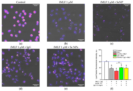 Effect of SeNPs and antibodies on the degree of fMLF-induced degranulation of mouse granulocytes. Micrograph examples: (a) control; (b) cells stimulated for 15 min with 1 μM fMLF; (c) Cells stimulated with 15 min 1 μM fMLF in the background of 20 min preincubation with 1010 SeNPs/mL; (d) cells stimulated with 1 μM fMLF for 15 min followed by 20 min of preincubation with 0.5 mg/mL IgG; (e) Cells stimulated with 15 min of 1 μM fMLF followed by 20 min of preincubation with a combination of 0.5 mg/mL IgG and 1010 SeNPs/mL. (f) Fluorescence intensity of LysoTracker in the cytoplasm of cells in different variants of the experiment. All data are presented as a mean ± SE. The four independent experiments were carried out for each variant (n = 4). §—p < 0.05 vs. control without stimulus, one-sample signed-rank test Z-statistic (based on positive ranks). *—p < 0.05, Kruskal–Wallis one-way analysis of variance on ranks with pairwise multiple comparison by Tukey Test. All images were obtained at similar settings of laser power, gain and pine hole. The equal dynamic range for the lookup table for LysoTracker was applied in all images. The equal dynamic range for the lookup tables was applied in all images. The photomicrographs are presented as an overlay of images in the visible region (gray) and pronounced LysoTracker fluorescence (table selection “fire”).