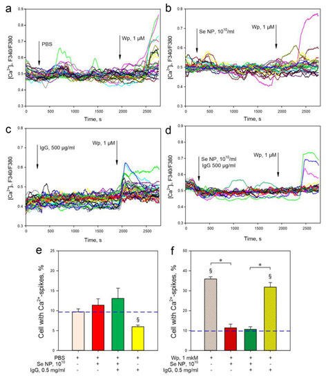 The assessment of the proportion of granulocytes with calcium spikes (responses). Examples of cell responses (~30) in randomly taken areas of the visual field with the background of PBS (control) (a), SeNPs (b), a combination of SeNPs and IgG (c) and IgG (d) followed by the addition of 1 μM Wp. The proportion of cells with calcium responses immediately after supplementation with PBS (control), SeNPs, IgG, or a combination of SeNPs and IgG (e). The proportion of cells with calcium responses to 1 μM Wp supplementation after 20 min incubation with indicated agents (f). The panels (e,f) show the average data for all cells in the field of view. In each variant, the study was performed on six cell samples; in each, at least 200 cells were analyzed. Data are presented as a mean ± SE. §—p < 0.05 vs. PBS (blue dotted line), *—p < 0.05 between indicated variants. The significance of differences was assessed by the Mann–Whitney test. The six independent experiments were carried out for each variant (n = 6).