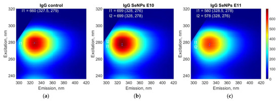 Since SeNPs at a concentration of 10−9 mL−1 did not significantly affect the optical absorption and refractive index of protein solutions, then the lowest concentration of nanoparticles used in the study was 10−10 mL−1. The effect of SeNPs on the fluorescence of IgG molecules was studied (Figure 10). It has been shown that a solution of protein molecules fluoresces most intensely at a wavelength close to 330 nm (327–329 nm) when excited at a wavelength close to 280 nm (278–279 nm). The addition of SeNPs did not significantly affect the shape of the fluorescence regions on the 3D map. The most effective excitation and emission wavelengths did not change. In this case, the addition of SeNPs led to a decrease in the intensity of the fluorescent signal. Thus, when SeNPs (1010 mL−1) were added, the fluorescence intensity decreased by more than 5%. When the SeNPs were added at a concentration of 1011 mL−1, the fluorescence intensity decreased by almost 20%.