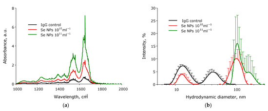 The effect of SeNPs on the change in vibrational–rotational spectra (a) and the evolution of nanoparticles in size (b) observed in IgG solution. The three independent experiments were carried out for each variant (n = 3).