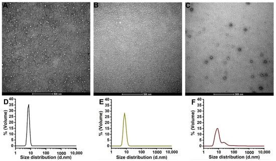 Representative images obtained by TEM (A–C) and distribution percentage by volume graphs of the micelles analyzed by DLS (D–F). The images and graphics are, respectively, from the following samples: (A,D) micelles formed in Pluronic® F127 solution in water; (B,E) micelles formed from the hydrogel solution without VADE; and (C,F) micelles formed from VADE-loaded-hydrogel (1:10). The experiment was performed once and in triplicate. Scales bar = 500 nm.