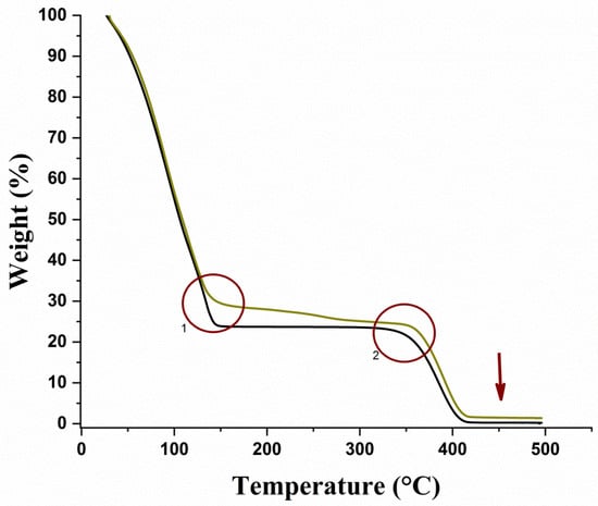 A high percentage of samples’ mass loss occurred between 30–143 °C. The loss was approximately 70% and 75% of the weight, regarding the VADE-loaded-hydrogel and the one without VADE, respectively. This thermal degradation is mostly associated with the water loss of the polymeric hydrogel matrix. As reported in the literature, temperature ranges from 25 to 140 °C are associated with water loss in thermogravimetric analysis [55,56,57,58,59], and this large reduction in water-related mass is consistent since water is the most important ingredient of hydrogel formulations. However, at 128.6 °C, the behavior of the curves slightly changed, and, at around 140 °C, the hydrogel without VADE lost approximately 5% more of its mass, when compared to the VADE-loaded-hydrogel (Figure 2; circle 1). This result is compatible with the hydrogel composition since the VADE-loaded-hydrogel contains 5% w/w of VADE, which replaces 5% of water in the hydrogel without VADE.