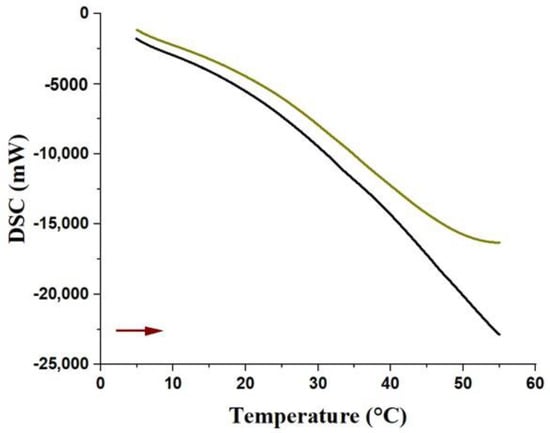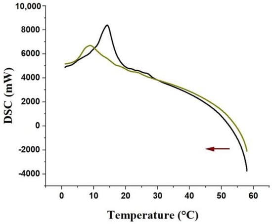 The melting process can be analyzed by the onset temperature (Tonset), the peak temperature (Tpeak), and the endset temperature (Tendset). The hydrogel without VADE showed Tonset at approximately 20 °C, Tpeak at 15 °C, and Tendset at approximately 10 °C (Figure 5, black curve). The effect of VADE presence on these transitions is evident in the exothermic peak shift to lower temperatures (Figure 5; green curve), and the following results were obtained: Tonset at approximately 12 °C, Tpeak at 5 °C, and Tendset at approximately 2 °C.