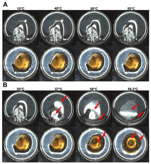 The simultaneous video recording showed important physical alterations of the samples during DSC experiments (Supplementary Videos S1 and S3). It was possible to observe that during heating from 15–55 °C (Figure 4A; 15.0, 40.0, 50.0, and 55.0 °C) the samples did not present significant physical alterations. However, in the temperature range from 55 °C to 58.2 °C, drastic changes in the hydrogel characteristics were registered (Figure 4B): both hydrogels (with and without VADE) were subject to gradual phase transitions due to the increase in the temperature (at 55.0, 57.0, 58.0 and 58.2 °C; Figure 4). However, in the absence of VADE, the hydrogel suffered a disorderly deformation in which two phases were observed at the end of heating (Figure 4B; top). In contrast, the presence of VADE promoted a circular spatial organization of the sample, with a clear greenish center part surrounded by a dark-colored halo (Figure 4B; bottom).