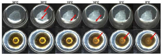 Respective images of hydrogel samples were recorded simultaneously by video during the DSC analysis. The range of temperature from the left to the right was: 30 °C, 20 °C, 15 °C, 10 °C, 5 °C, and 0 °C. The images are, respectively, taken from the following samples: hydrogel without VADE (up-panel) and VADE-loaded-hydrogel (down-panel). The arrows show the main physical changes observed in the samples.