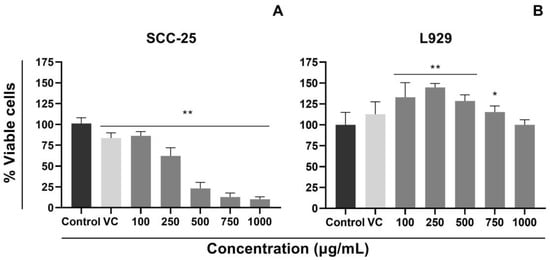 The tumor cell line (SCC-25) presented a completely different profile, and all concentrations showed significant differences (p < 0.01) when compared to the control group (Figure 7A; p < 0.01). A dose-dependent response was detected, and the lowest concentration (100 µg/mL) decreased the cell viability by approximately 20%, followed by 250 µg/mL (40% of reduction). The higher concentrations, from 500 µg/mL to 1000 µg/mL, reduced the viability by more than 80%. The vector control showed low cytotoxicity and decreased the cellular viability by approximately 20% in comparison to the control group (p < 0.01). Previous studies carried out by our group evaluated the cytotoxicity of two hydrogels by WST-1 colorimetric assay [25]. Both formulations, one containing VADE and the other containing aqueous extract of V. album subsp. abietis, promoted cytotoxicity against tumoral cells (Yoshida and MOLT-4) in a dose-dependent manner [25].