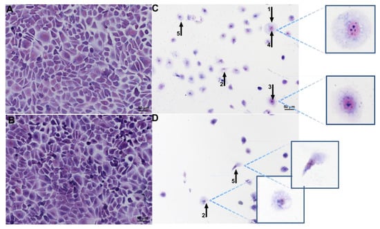 Morphological changes of SCC-25 cells assessed by Giemsa staining, after 24 h of treatment. (A) Negative control; (B) Vector control (hydrogel without VADE) at higher concentration; (C) VADE-loaded-hydrogel at the concentration of 250 µg/mL and (D) 500 µg/mL. The arrows and insets in (C,D) highlight the most important cellular morphological alterations, such as: 1—rounding and swelling; 2—vacuoles; 3—chromatin condensation; 4—chromatin fragmentation; 5- lysis. The intensive cellular lysis was detected at a higher concentration of VADE-loaded-hydrogel (D). Scale bars = 50 µm.