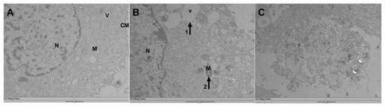 Morphological changes of SCC-25 cells assessed by transmission electron microscopy, after 24 h of treatment. (A) SSC-25 without treatment (control); (B) SCC-25 treated with 500 µg/mL of VALE-loaded-hydrogel (arrow 1: cytoplasmatic vacuole; arrow 2: mitochondria damage); (C) SCC-25 treated with 500 µg/mL of VALE-loaded-hydrogel: intensive cell lysis. M: Mitochondria; V: vacuole; CM: cytoplasmatic membrane; N: nucleus. Scale bars: 2 µm.