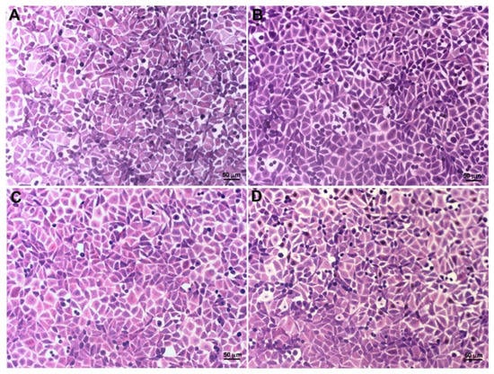 Morphological aspects of L929 cells were assessed by Giemsa staining, after 24 h of treatment. (A) Negative control; (B) Vector control (hydrogel without extract) at higher concentration; (C) VADE-loaded-hydrogel at 500 µg/mL; (D) VADE-loaded-hydrogel at 1000 µg/mL. Scale bars = 50 µm.