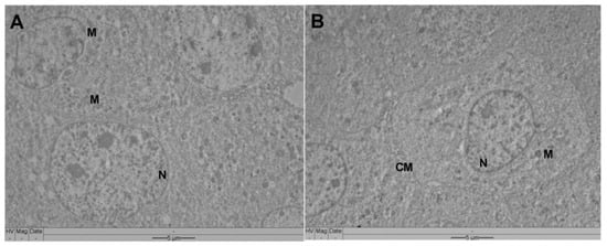Morphological changes of L929 cells were assessed by transmission electron microscopy, after 24 h of treatment. (A) Negative control; (B) VADE-loaded-hydrogel at 500 µg/mL of extract. M: Mitochondria; N: nucleus; CM: cytoplasmatic membrane. Scale bars: 5 µm.
