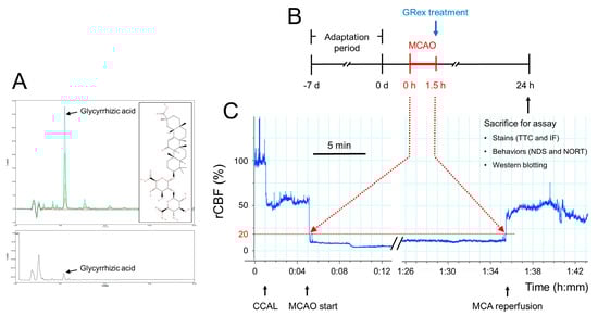 High-performance liquid chromatography (HPLC) analysis and experimental design for middle cerebral artery occlusion (MCAO) mice model: (A) HPLC chromatogram of the glycyrrhizic acid standards and its chemical structure (upper panel) and the methanolic extract of GR (GRex) (lower panel); conditions used: HPLC, YL-9100 system; column, ZORBAX Eclipse XBD-C18; mobile phase, a mixture of acetonitrile and 1% acetic acid in water (40:60, v/v); wavelength, 254 nm; column temperature, 25 °C; flow rate, 1.0 mL/min; injection volume, 10 μL; (B,C) ischemic stroke model in mice; mice were adapted for seven days at animal facilities. The MCAO was maintained for 90 min, and it was confirmed that relative cerebral blood flow (rCBF) was continuously maintained under 20%. After MCAO, GRex was administered, and biological indicators of experimental animals were measured at 22.5 h after reperfusion; CCAL, common carotid artery ligation.