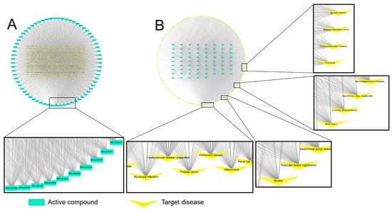 Visualization of compound–disease networks of Glycyrrhizae Radix et Rhizoma (GR). The light green nodes (rectangle-shape) represent the active compounds of GR, and the yellow nodes (V-shape) represent diseases. The gray lines represent the interaction of each compound and its target diseases: (A) the yellow inner nodes represent diseases, and the light green outer nodes represent active compounds of GR; (B) the inverted form of network A.