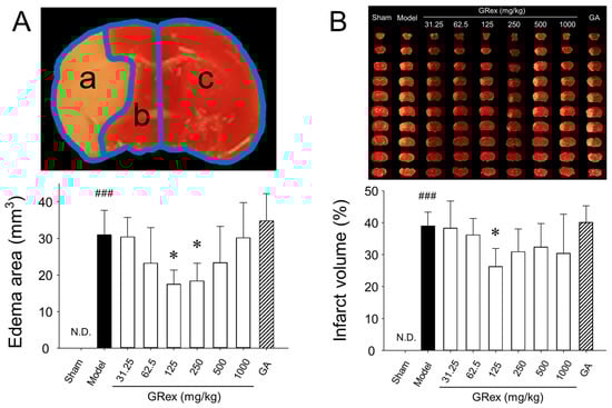Ten brain tissue sections (1 mm) were obtained from the brain, excluding the olfactory bulb and cerebellum. TTC staining was used to acquire optical images of the damaged area and to identify the edema area (Figure 3A) and the infarct volume (Figure 3B). No edema or cerebral infarction was observed in the sham group. In contrast, a relatively extensive area of damage was observed in the model group. A significant reduction in brain edema was observed in mice administered 125 or 250 mg/kg body weight concentration of GRex (p = 0.031 and p = 0.046, respectively), and cerebral infarction was significantly reduced (p = 0.042) at the concentration of 125 mg/kg GRex. The cerebral infarction tended to increase when the dose concentration was increased to 500 mg/kg and 1000 mg/kg of GRex. In TTC-stained images, dot-like micro bleedings were observed (Figure S1), and it is presumed that these micro bleedings increased brain edema and infarction.