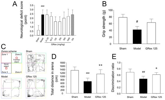 3.3. Effects of GRex on Changes of the Forepaw Grip Strength and Behavior Tests