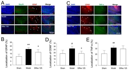 CD68 is a lysosomal protein expressed at high levels by macrophages and activated microglia at low levels by resting microglia. Microglial activation is observed in CNS diseases and is important for coordinating immune system resources during disease-associated neuroinflammation [,]. TNF-α is an inflammatory cytokine produced by macrophages or monocytes during acute inflammation and is involved in various signaling events within cells leading to necrosis or apoptosis [,]. As a result of immunofluorescent staining, the cells showing a CD68+ and TNF-α expression in the MCAO model group were significantly increased compared to the sham group. When the GRex extract was administered, the expression of TNF-α was not affected, but CD68+ cells appeared to be significantly reduced (Figure 5C–E and Figure S3).