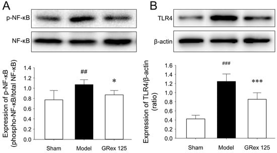 NF-κB is considered a regulator of innate immunity, and acute cerebral ischemia induces an innate immune response, resulting in a cascade of events leading to necrotic death of neurons and damage to supporting structures of neurovascular units. NF-κB activation is initiated when molecules such as TNF-α bind to TNF receptors, and the induction of NF-κB target genes requires phosphorylation of NF-κB proteins, such as p65; therefore, factors that modulate the activity of NF-κB may modulate the inflammatory process in ischemic stroke [,,]. TLR4 activation is associated with proinflammatory cytokine expression and activation of the NF-κB signaling pathway, and TLR4 expression is positively correlated with TNF-α levels [,]. In the current study, MCAO induction increased the expression of p-NF-κB and TLR4 proteins (p = 0.007 and p < 0.001, respectively) in the ipsilateral hemispheric brain. GRex administration with 125 mg/kg downregulated the expression of p-NF-κB and TLR4 proteins (p = 0.031 and p < 0.001, respectively) (Figure 6A,B).