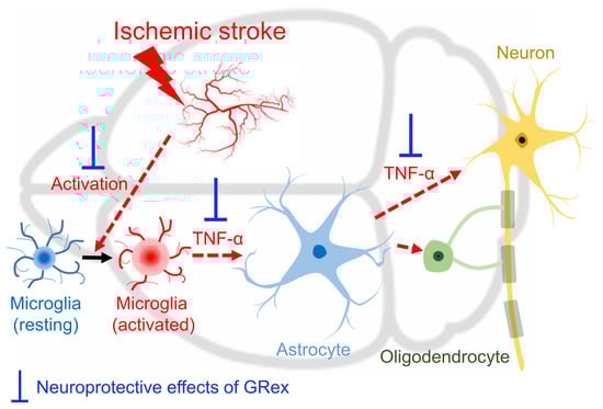 Schematic image of the anti-inflammatory action mechanism of GRex in MCAO mice model. Thickened brown bars indicate the predicted action site of GRex post-treatment on ischemia/reperfusion-induced brain damage.
