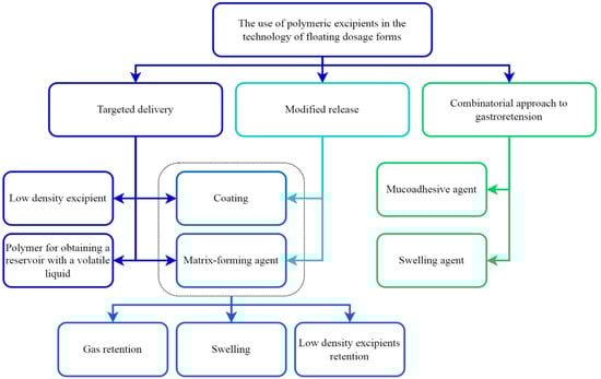 As mentioned above, the main advantages of floating gastroretentive systems are targeted delivery and the modified release of the API. Each of these properties is most often realized through the use of certain Es, in most cases of a polymeric nature (Figure 1).